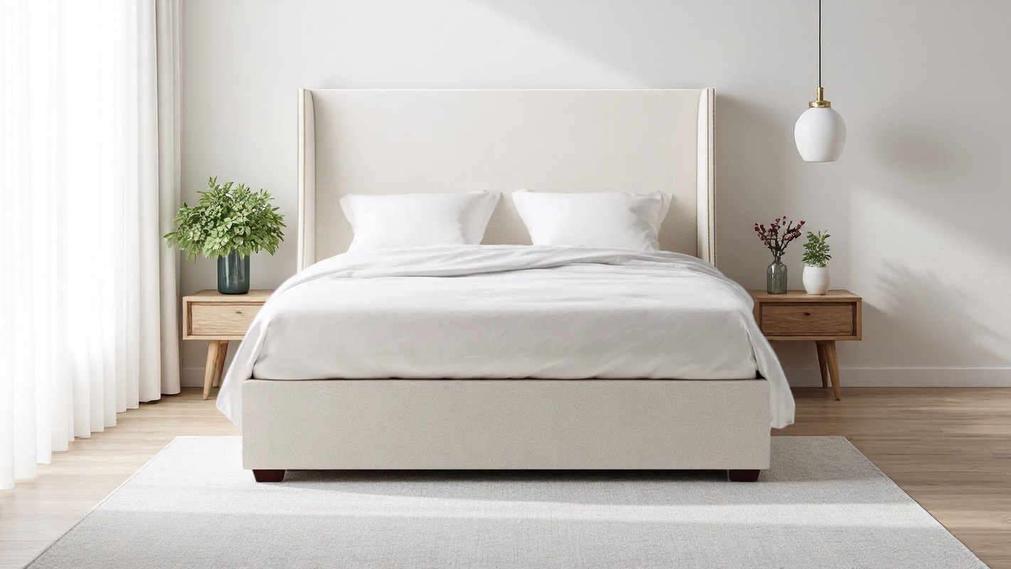 Lit double en tissu 214x190x120 cm - beige clair - design épuré contemporain