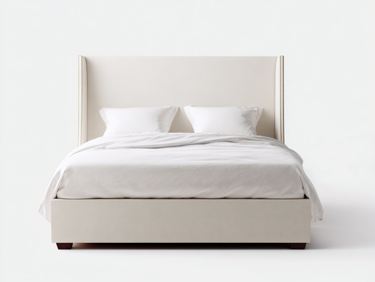 Le lit est habillé d'un tissu beige clair à la texture fine et homogène, offrant un toucher agréable. La structure interne robuste assure la stabilité et la durabilité du lit, adaptées à une utilisation quotidienne.